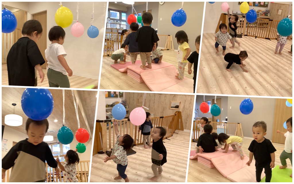 お友達と一緒に風船を叩いてみたり、保育者と一緒に手を伸ばしてみたり、体をたくさん動かして遊びました。