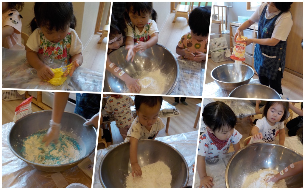 水や油の量が少し違うだけで感触は変わり、そこからの子ども達のあそびの発展も変わります。パン屋さんになってパンを作る時もあればおままごとに発展することも。型抜きを楽しむ時もあります。