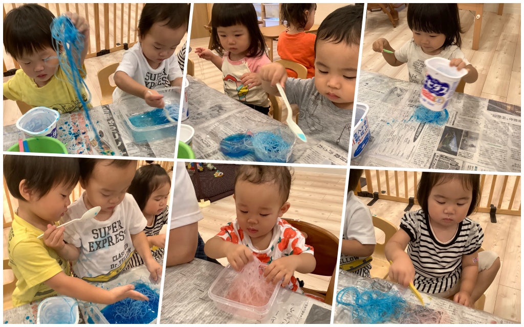 色水を吸った綺麗な春雨は、楽しい玩具に大変身。隣の容器に移してみたり、スプーンを使って混ぜてみたり、子ども達の遊びの発想は無限ですね。